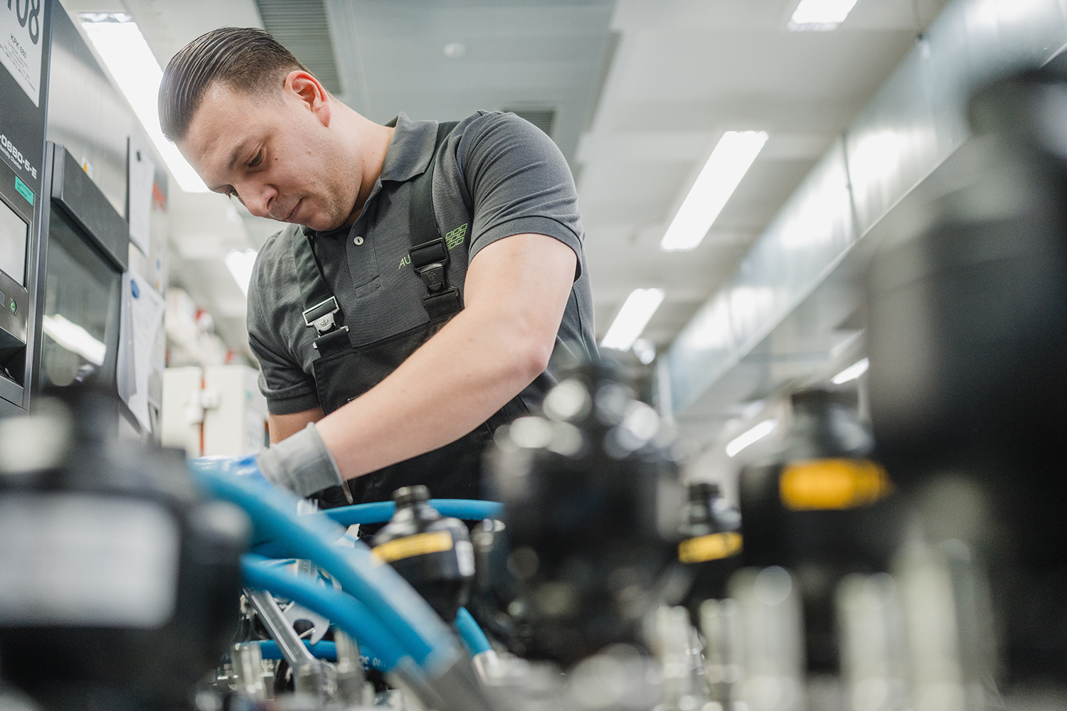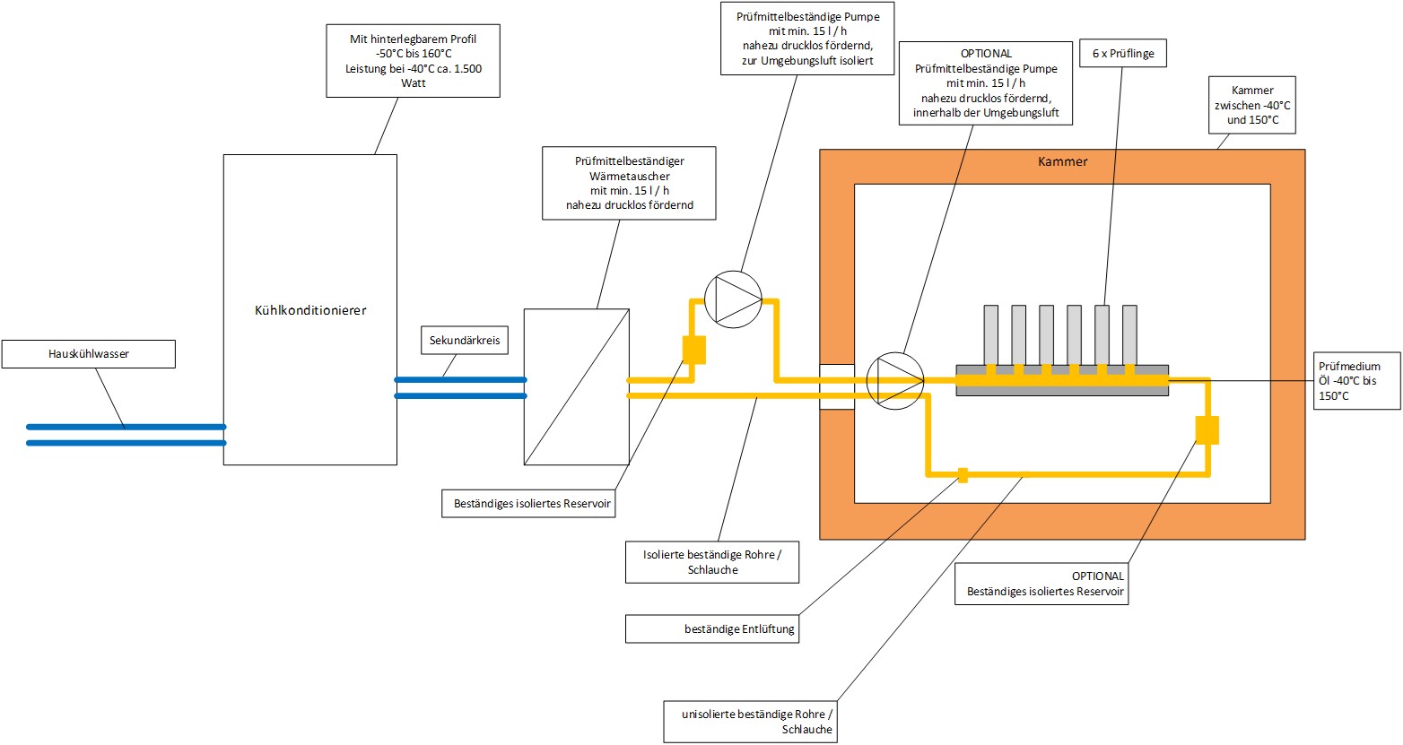 Wir entwickelten einen maßgeschneiderten Mehrfachprüfstand mit durchgängiger Automatisierung, Öl Konditionierung und integrierter Sicherheitskette. Dieser modulare Prüfstand wurde ausgelegt auf die simultane Prüfung von sechs Pumpen. Die elektrische Versorgung erfolgt mit bis zu 800 V DC und bis zu 30 kW je Prüfplatz. Eine zentrale Öl Konditionierung deckt −40 °C bis +140 °C ab und ermöglicht stabile Sollwerte, Rampen und Temperatursprünge. Für Steuerung und Diagnose wurden High Speed CAN und LIN integriert; Rest-Bus-Simulation, Flash und Diagnoseroutinen sind eingebunden. Ein kombiniertes Soft und Hard Safety Control System mit Isolationsüberwachung (Isowächter), Interlocks und HV/LV Trennung stellt die Prüfsicherheit sicher.
