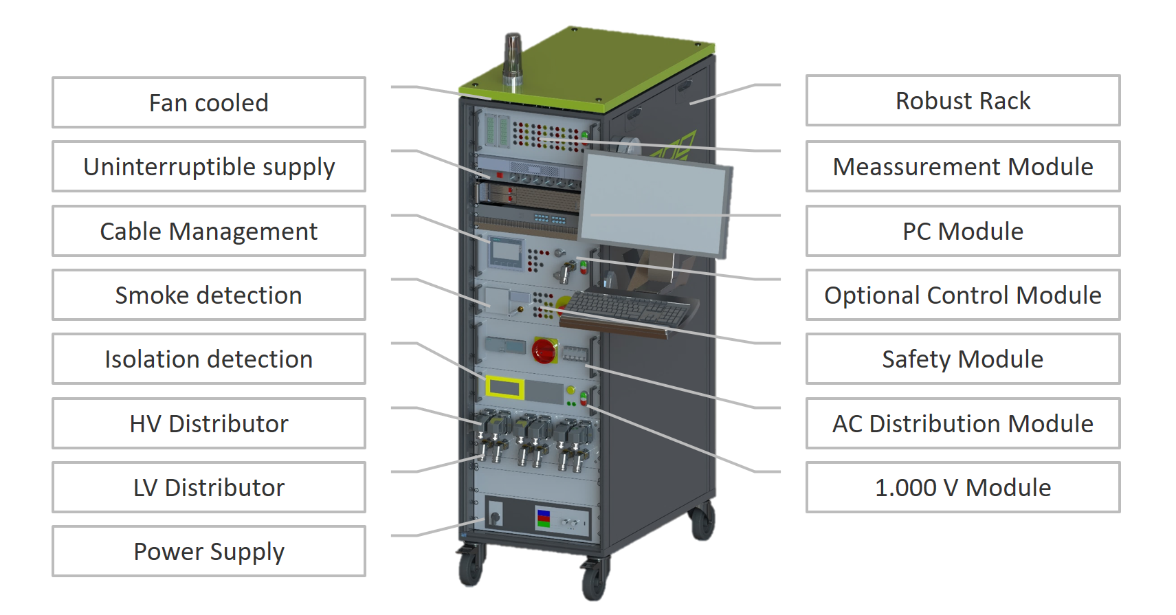 - Hohe Wiederverwendbarkeit: Ein Rack für viele Prüflinge. Wechsel zwischen Komponentenklassen, etwa HV-Heizer bis 15 kW mit 18 kW Kühlleistung, HV-Steckverbinder bis 1.000 V und 1.010 A je Pfad oder Hydraulikpumpen bis 30 kW, erfolgt über definierte Module und Anschlusspakete.